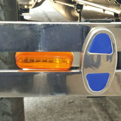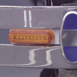 Mounting Logo Lites bumper brackets is very easy. Front bumper mounted bumper brackets mount in just about a minute each and the rears take about two minutes apiece. To mount, simply use a wrench to remove bumper clamp nut and washer from bumper clamp stud. On rear bumpers, loosen the bumper bar bolt that goes through the bumper bracket so you can swing the bumper away from the fender. Hold the bumper parts together as an assembly and rotate the bumper so the stud is out of the bracket hole. Side the LED signal light over the clamp stud and reassemble the bumper.
